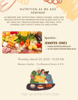 Come and receive nutrition information for older adults to eat healthy, reduce disease risk, and deal with changes that affect appetite and eating.